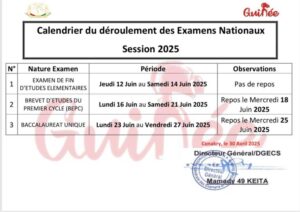Le Ministère de l’enseignement pré-universitaire et de l’Alphabétisation a rendu public ce vendredi, 02 mai, le calendrier des examens nationaux session 2025.