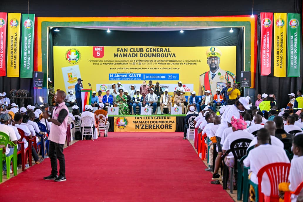 À la Maison des jeunes de N’Zérékoré, plus de 350 agents vulgarisateurs venus des six préfectures de la région forestière et des quartiers de la capitale régionale ont participé à une session de formation des formateurs. La cérémonie d’ouverture a été présidée par le ministre de la Pêche et de l’Économie numérique, Fassou Thea, en visite dans la région. Il a déclaré : « Malgré un agenda chargé, nous avons tenu à prendre part à cette initiative. Elle s’inscrit dans une logique citoyenne et inédite, car pour la première fois, des personnes sont directement formées dans les quartiers pour expliquer la Constitution aux populations. C’est une démarche extraordinaire. »