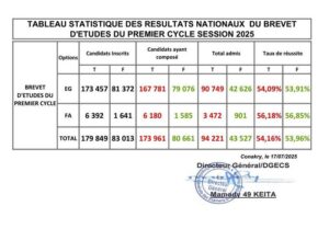 Après la proclamation des résultats de l’examen de fin d’études élémentaires (CEE), le Ministère de l’Enseignement Pré-Universitaire et de l’Alphabétisation (MEPUA) vient de rendre public le tableau statistique national des résultats du Brevet d’Études du Premier Cycle (BEPC), session 2025.