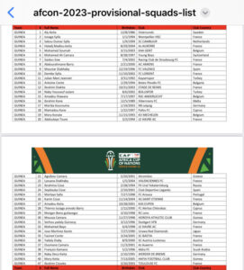 La Confédération Africaine de Football (CAF) a publié ce mercredi 20 décembre 2023, les listes des joueurs présélectionnés des équipes qualifiées à la phase finale de la Coupe d’Afrique des Nations (CAN) Côte d’Ivoire 2023.