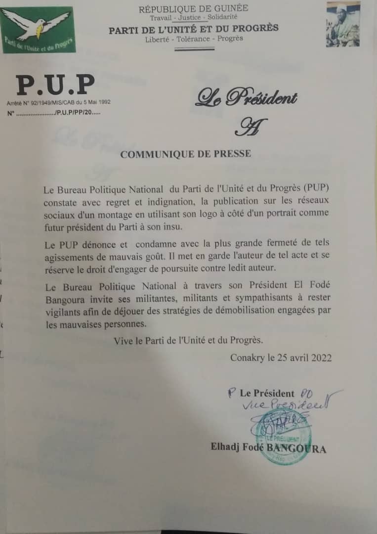 Le Bureau Politique National du Parti de l’Unité et du Progrès (PUP), constate avec beaucoup de regret et d’indignation, la publication sur les reseaux sociaux, d’un montage en utilisant son logo à côté d’un portrait comme future Président du parti à son insu.