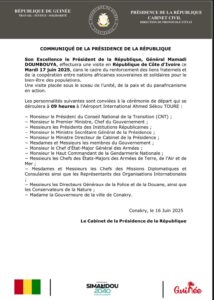 La Présidence de la République de Guinée informe, à travers un communiqué parvenu à notre rédaction , que le Chef de l’État, le Général Mamadi Doumbouya, va quitter le pays ce mardi, à 9h, pour une visite de travail et d’amitié en Côte d’ivoire.