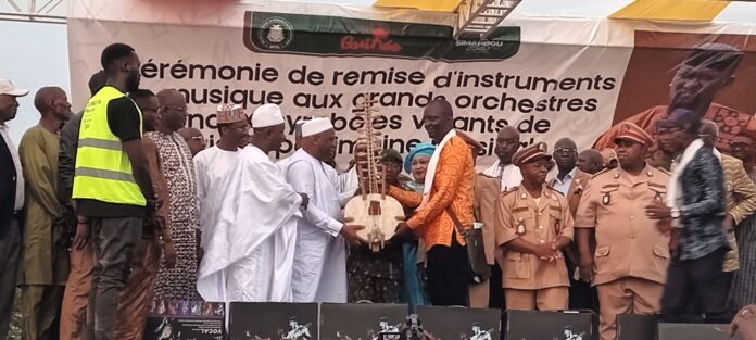 régions, nos préfectures, nos villages, nos quartiers qui retrouvent leur souffle, leur vibration, leur voix . Nous lançons ici un vaste chantier de renaissance ancestrale, enraciné par la mémoire glorieuse de notre passé musicale mais tourné résolument vers l’avenir. Nous refusons l’immobilisme, ces formations musicales, ne seront pas de simples vestiges folkloriques subventionnés, mais elles viendront des entités vivantes, dynamiques et économiquement viables, capables de produire, de se produire, de rayonner et de générer leur propre revenu. C’est donc une relance cartes historique, mais avec un nouveau modèle économique. L’Etat pour sa part s’engage à créer l’environnement favorable, à faciliter l’accès aux espaces, aux opportunités, aux ressources mais, il ne financera pas directement leur fonctionnement, c’est pourquoi je tiens à saluer la présence ici des préfets, qui nous ont fait l’honneur d’être ici car, ce seront eux, via le ministère de l’administration du territoire et de la décentralisation, les artisans de cette mutation, les garants de l’engrage territoriale et de la durabilité et la durabilité de ce modèle. Cette dynamique, n’est pas née d’un seul ministère, elle est le fruit d’une coordination entre plusieurs départements, le ministère de mines et de la Géologie, qui a activé la responsabilité sociale des entreprises minières, je remercie donc à travers le ministère, des mines, particulièrement la société minière de Dinguiraye, le groupe GUICOPRES via la fondation KPC pour l’humanitaire, la société élite mining et d’autres sociétés minières qui suivront ums, smb, .. », explique Moussa Moïse Sylla, ministre de la culture, du Tourisme et de l’artisanat, aux invités et surtout aux bénéficiaires.